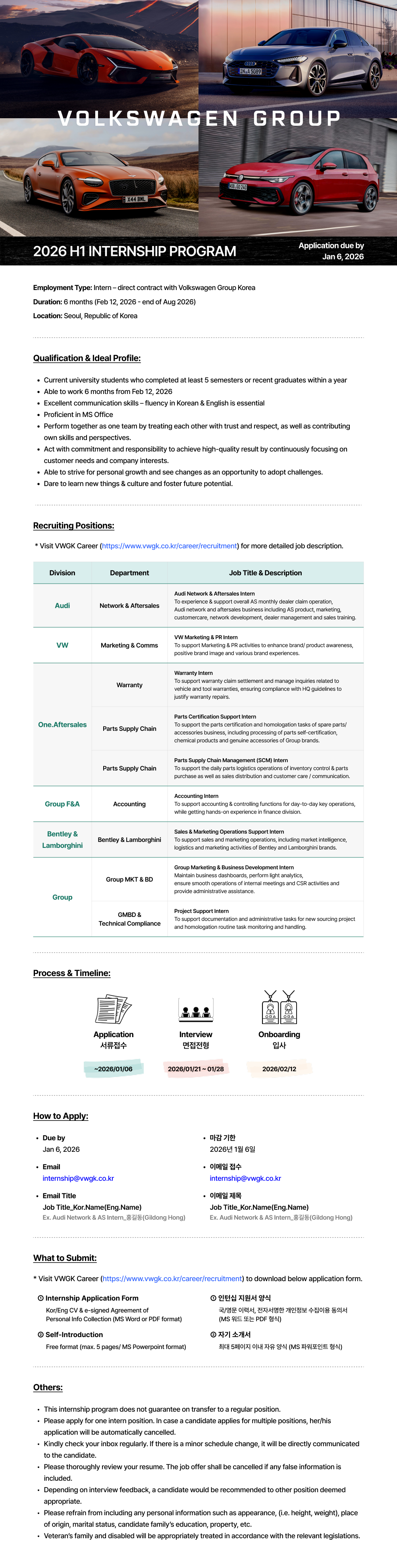 [폭스바겐그룹코리아] 2026 H1 INTERNSHIP PROGRAM 모집 (~1/6)