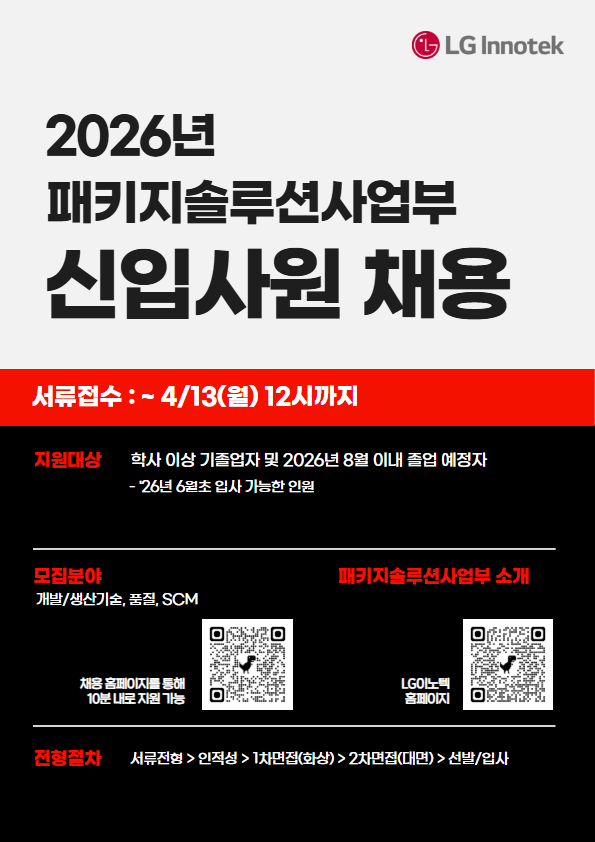 - 전형 단계별 진행사항은 LG Careers(https://bit.ly/4thB6gg)에서 확인하실 수 있으며, 이후 전형 일정은 합격자에 한하여 개별 안내됩니다.