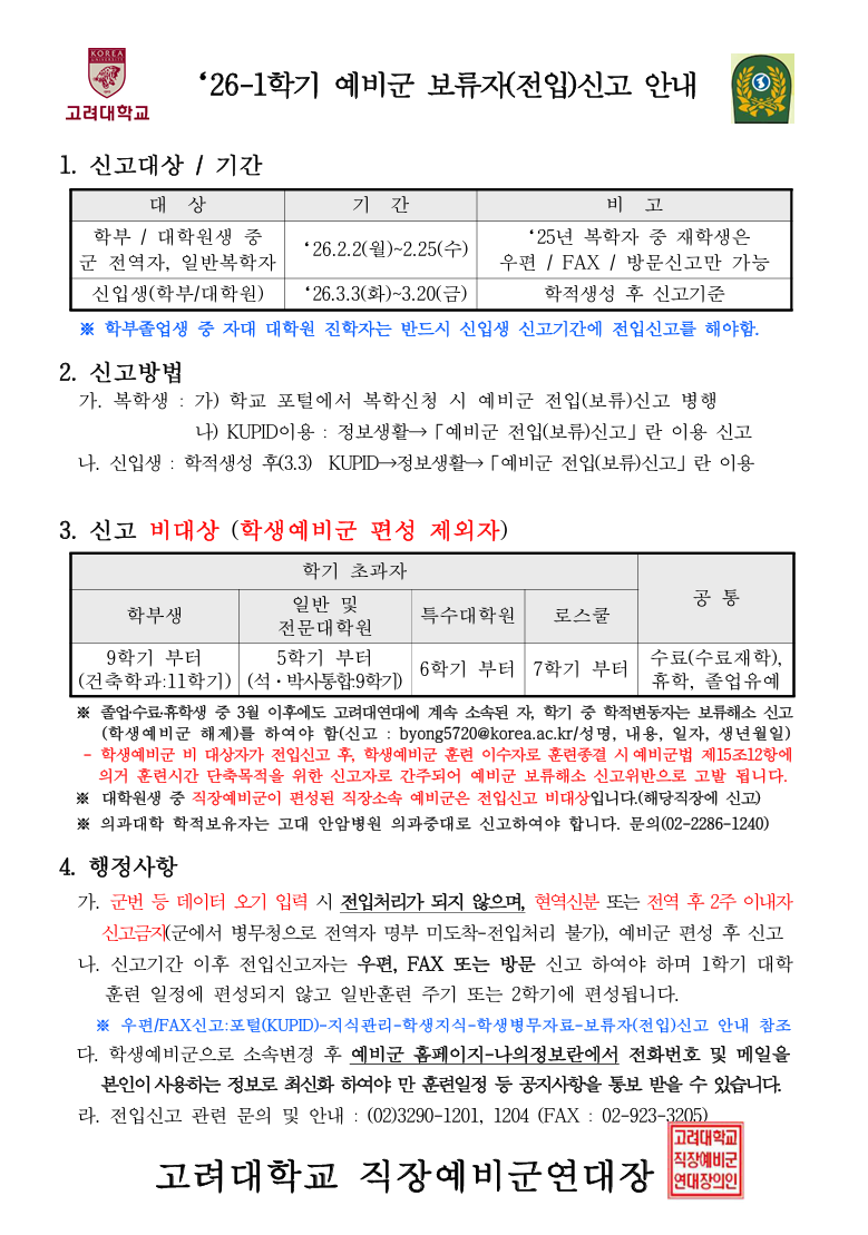 2026-1학기 학생예비군 보류자(전입) 신고안내 상세